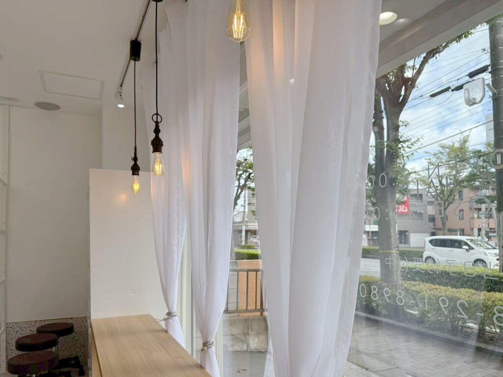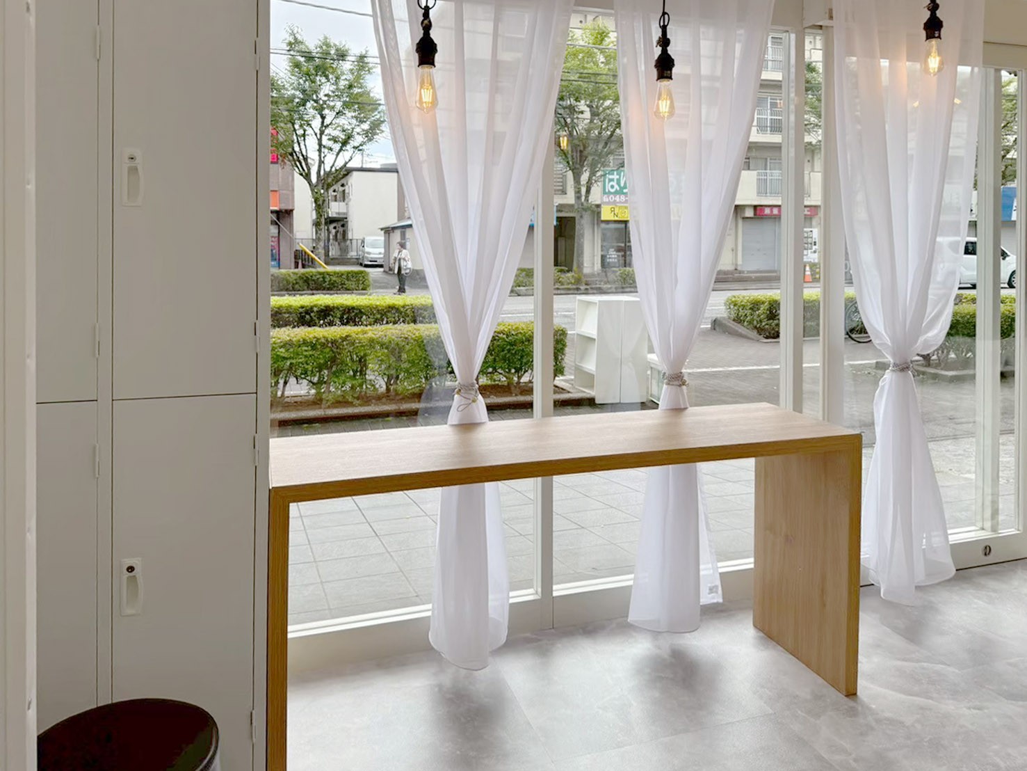 大きく採られた窓からはレースカーテン越しの自然光が差し込み、サロンをあたたかく照らします。ペンダントライトも、店内の雰囲気にあったものをチョイス。無機質さの中に素朴さをそっと忍ばせる、ナチュラルな空間を演出しました。