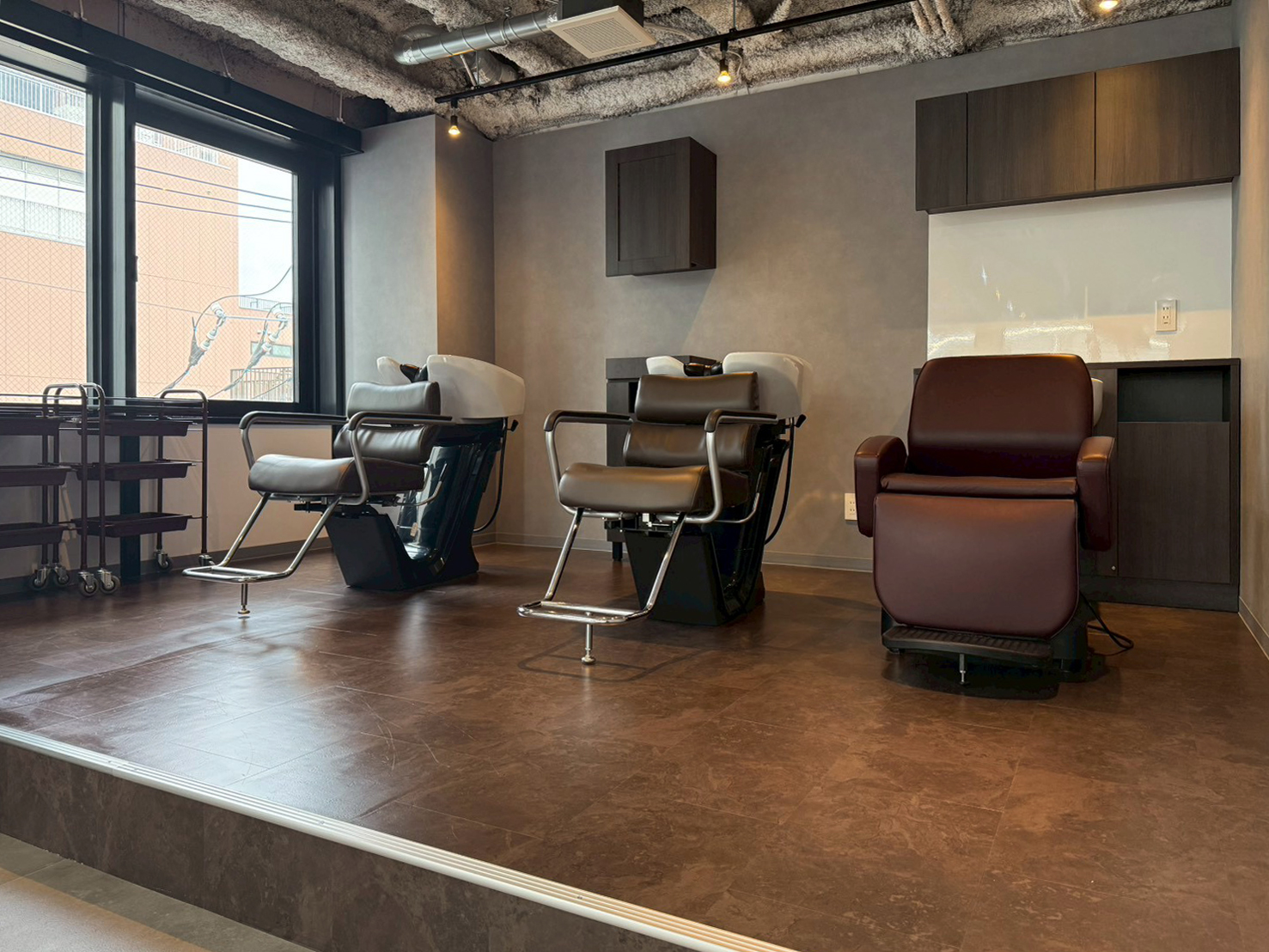 小上がりのようにして空間を分け、バックシャンプー・サイドシャンプーをそれぞれ二台ずつ設置しました。