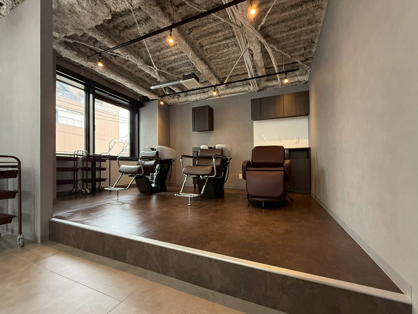 壁や天井の無機質な雰囲気はそのままに、インテリアなどのメインカラーをこっくりとしたブラウンにすることで、インダストリアル系のサロンが持つ『落ち着いた空気感』を強めた、くつろぎのスペースに仕上げました。