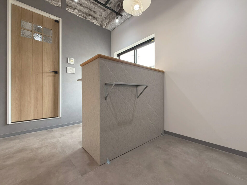 レジカウンターにはサロンマーケットオリジナル「Framu design(フラムデザイン)ペールモルタル×ウッド」を使用。コンクリート調ながら重くなりすぎない明るめトーンのグレーで、非常に使いやすい一台です。