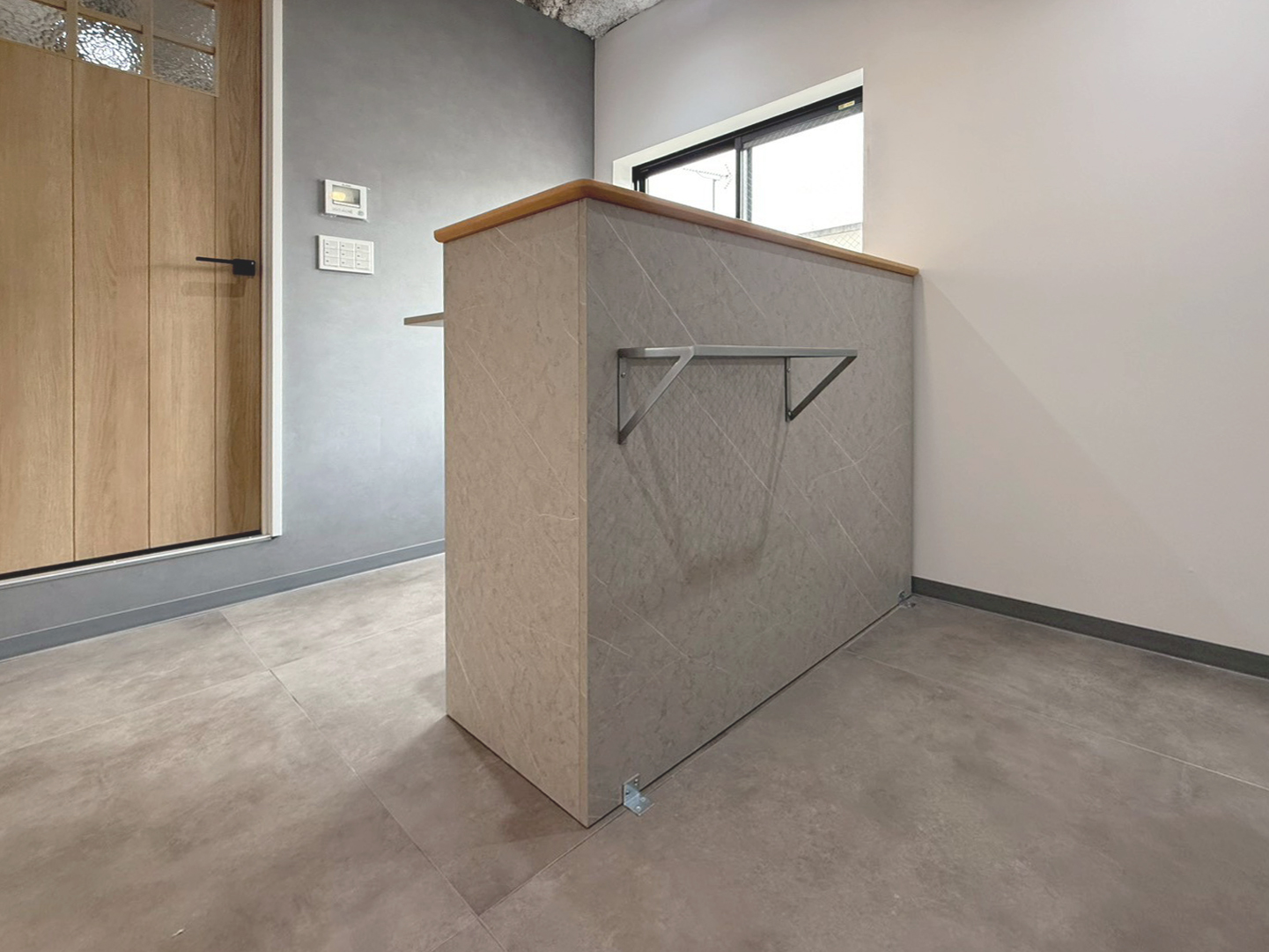 また、足元はペールトーンの石目調タイルを貼り付け、汚れ防止と掃除のしやすさを両立しました。
