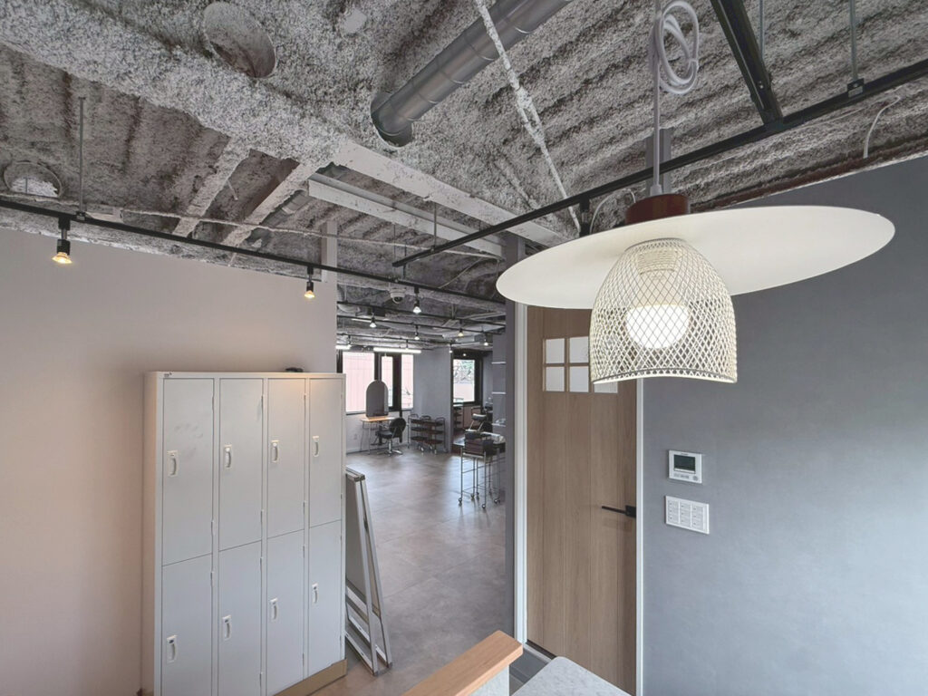 お荷物をお預かりするロッカーは壁と調和するようなグレーのものをセレクト。空間に溶け込むシンプルなデザインで、後ほど説明するお店の天井仕上げなどの風合いを邪魔しません。